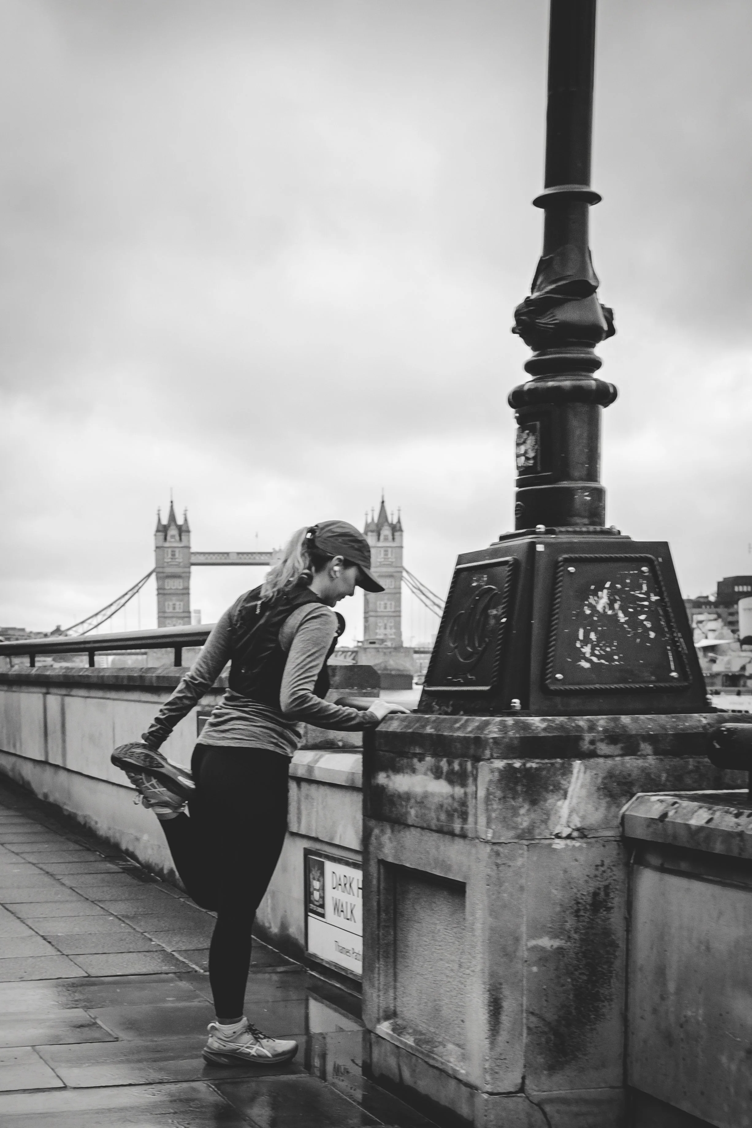 Just stretching, one foot pulled up behind her, hand on the cold stone, body leaning slightly forward. A practical pause. Nothing dramatic. Tower Bridge behind her, doing what it’s always done, and being completely ignored.